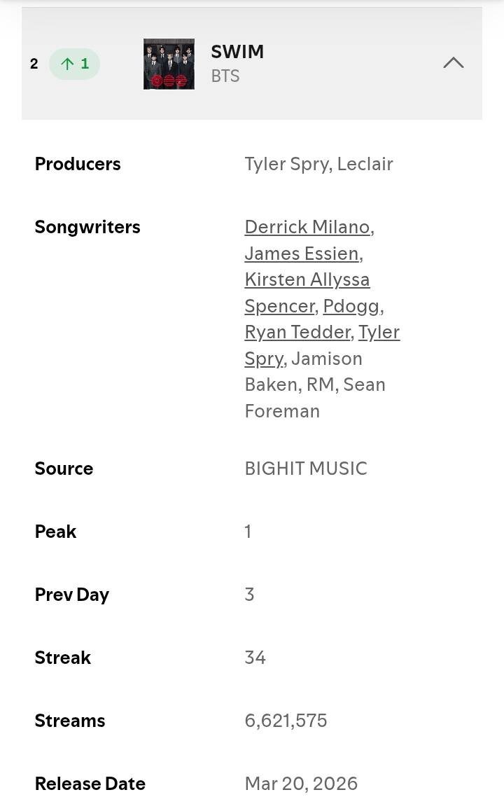🌷 "Swim" возвращается на 2-е место в глобальном ежедневном чарте Spotify.