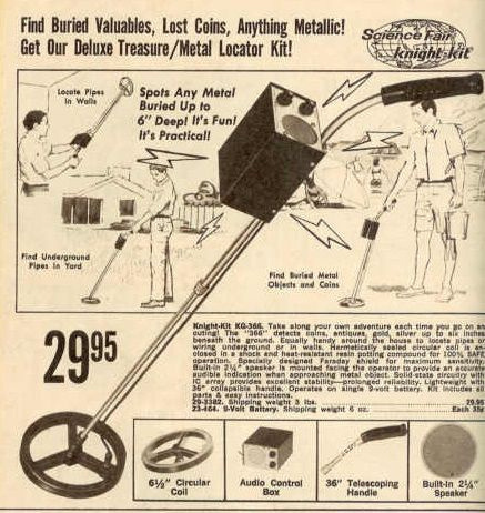 Knight-Kit KG-366 — это входной билет в мир поиска для тысяч подростков и радиолюбителей в конце 60-х — начале 70-х годов. Это был не просто готовый прибор, а целый проект для сборки дома. Всего $29.95! За эти деньги покупатель получал полный набор деталей, который нужно было спаять самому. Это делало его одним из самых доступных металлоискателей на рынке США. В рекламе подчеркивали, что он «Fun» и «Practical». Им предлагали искать не только клады, но и потерянные монеты, антиквариат или даже трубы в стенах дома. Прибор работал на одной 9-вольтовой батарейке. Внутри была современная на тот момент твердотельная схема (solid-state) с использованием интегральных схем (IC array), что обеспечивало отличную стабильность для такого бюджетного устройства. Детектор оснащался 6.5-дюймовой круглой катушкой с электростатическим экраном (Faraday shield) для защиты от помех. Штанга была телескопической (36 дюймов), что позволяло легко складывать прибор для транспортировки. Вместо дорогих наушников з