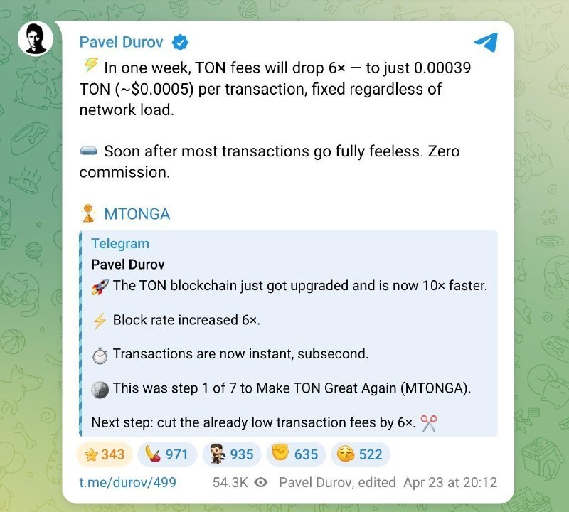 Комиссии в TON уже через неделю просядут сразу в 6 раз — до каких-то 0,00038 TON (~0,0005$) за перевод, сообщил Дуров