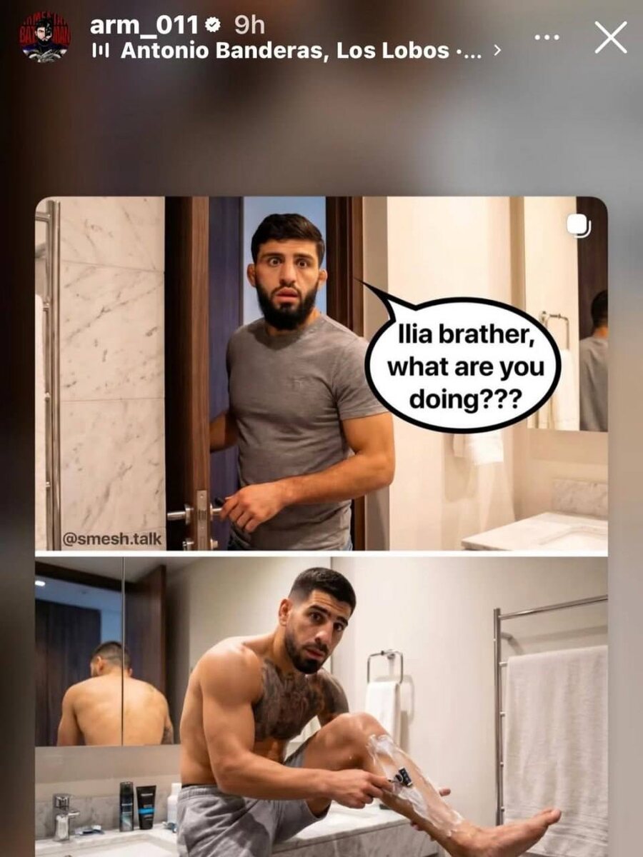 😂 Арман Царукян вывел биф с Илией Топурией на новый уровень! Противостояние топового легковеса и чемпиона UFC перешло из плоскости рейтингов в плоскость... трештока. Арман уверен, что Илия просто не вывозит его троллинг: «Топурия ненавидит меня, потому что я постоянно выставляю его на смех. Все в интернете смеются над ним». Но на этом «Ахалкалакец» не остановился и выдал максимально необычный аргумент, почему не считает Илию «настоящим мужчиной»: 🗣 «Он бреет задницу, а я — нет» 😂🤷🏻♂️ А затем и опубликовал забавную сторис☝️