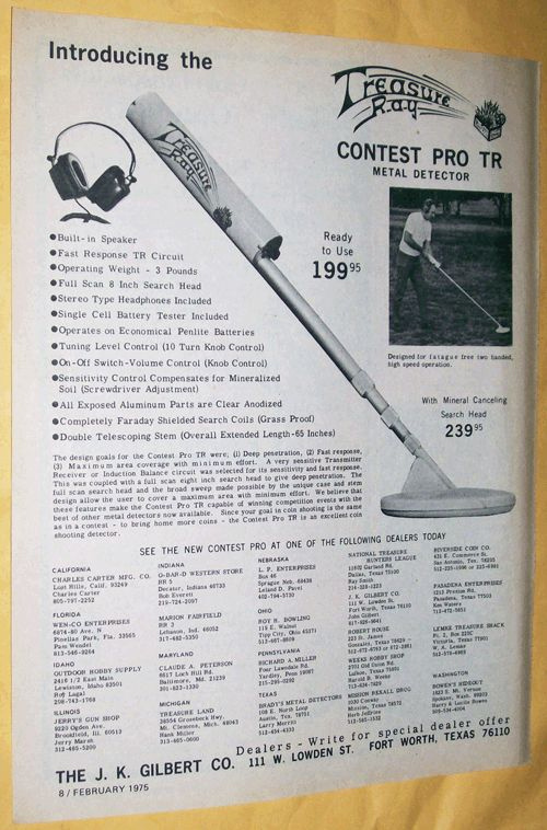 Этот прибор — настоящий «пришелец» из 70-х! На рекламной листовке представлен Treasure Ray Contest Pro TR, который выделяется своим невероятно странным для нашего времени дизайном в виде бейсбольной биты. В середине 70-х конкуренция на рынке США была бешеной, и компания J. K. Gilbert Co. из Техаса решила сделать ставку на радикальную эргономику. Они создали прибор, который должен был стать «королем» соревнований по скоростному сбору монет. Технические подробности из листовки: В 70-е в США были популярны «соревнования поисковиков» на время. Treasure Ray проектировался именно под такой формат: Это один из самых редких форм-факторов в истории. Фактически, это был металлоискатель для соревнований (слетов), что приравнивает его к понятию спорт-инвентарь.