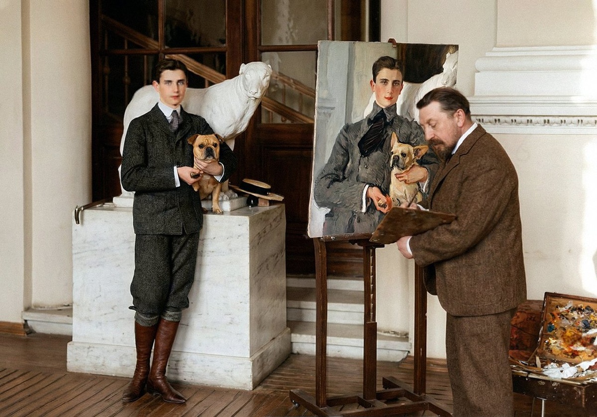 Это фото из студии Валентина Серова было сделано во время работы над портретом князя Юсупова. На дворе стоял 1903 год, и фото изначально было черно-белым. Но мы показываем вам снимок после реконструкции цвета от художницы Ольга Ширниной (klimbim). А следом демонстрируем сам портрет кисти Серова из архива Русского музея. Итого у нас есть князь Юсупов на оцветненном снимке, князь Юсупов на портрете на снимке и просто князь Юсупов на портрете. Три Юсуповых в одном посте! Скажите, все похожи?