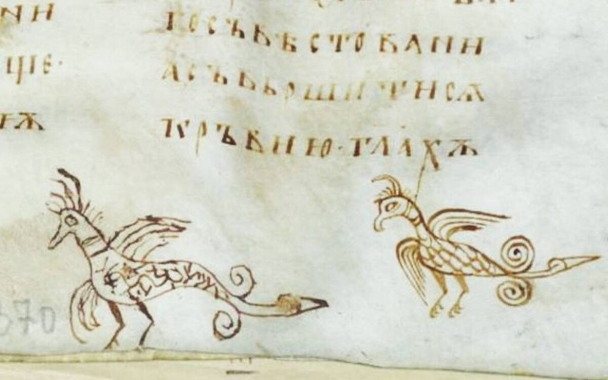Полевые украшения в рукописи XI века. Слова Григория Богослова, РНБ, Q.п.I.16 Средневековые писцы нередко подрисовывали небольшие картинки пером на полях рукописей. В одной из древнейших русских книг рисунки птиц, как правило, присоединены к длинным хвостам букв (З, Р, У, Х) на нижнем поле листа.