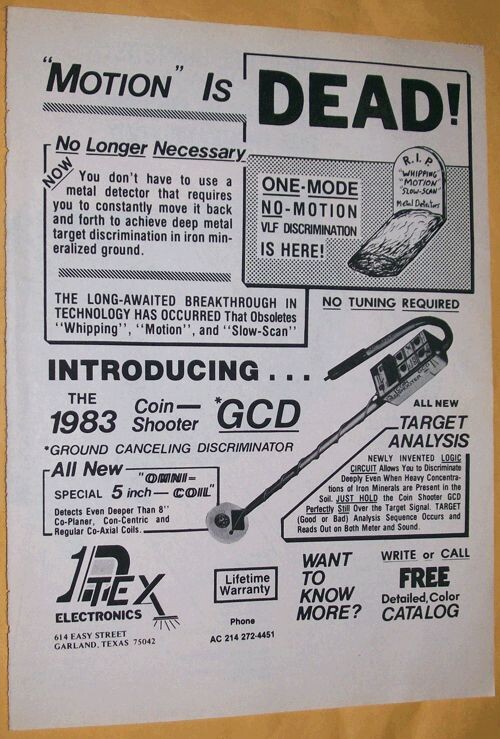 В 1983 году компания D-Tex Electronics (про нее мы уже писали в этой статье) выпустила прибор под названием GCD (Ground Canceling Discriminator), который буквально «похоронил» привычные методы работы того времени. В начале 80-х почти все детекторы с дискриминацией работали в динамическом режиме (Motion). Чтобы понять, что под катушкой — гвоздь или монета — поисковику приходилось постоянно водить прибором туда-сюда. D-Tex Coin Shooter GCD в 1983 году заявил: «Больше это не нужно!». Что сделало этот прибор особенным: Это история о том, как одна техасская компания из города Гарланд решила бросить вызов всем гигантам индустрии. Дизайн листовки с надгробной плитой, на которой написано «R.I.P. Motion», — это один из самых дерзких маркетинговых ходов в истории МД. Самые первые приборы (те же индукционные балансные схемы XIX века и военные миноискатели 40-х годов) по своей природе были статическими. Им не нужно было движение, чтобы обнаружить металл. Но у них была огромная проблема — они видел