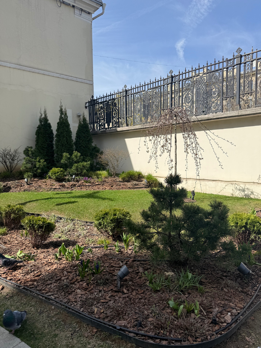 Туи, маленькие сосны, необычно подстриженные деревья смотрятся очень гармонично. Отдельного внимания заслуживают фонари.