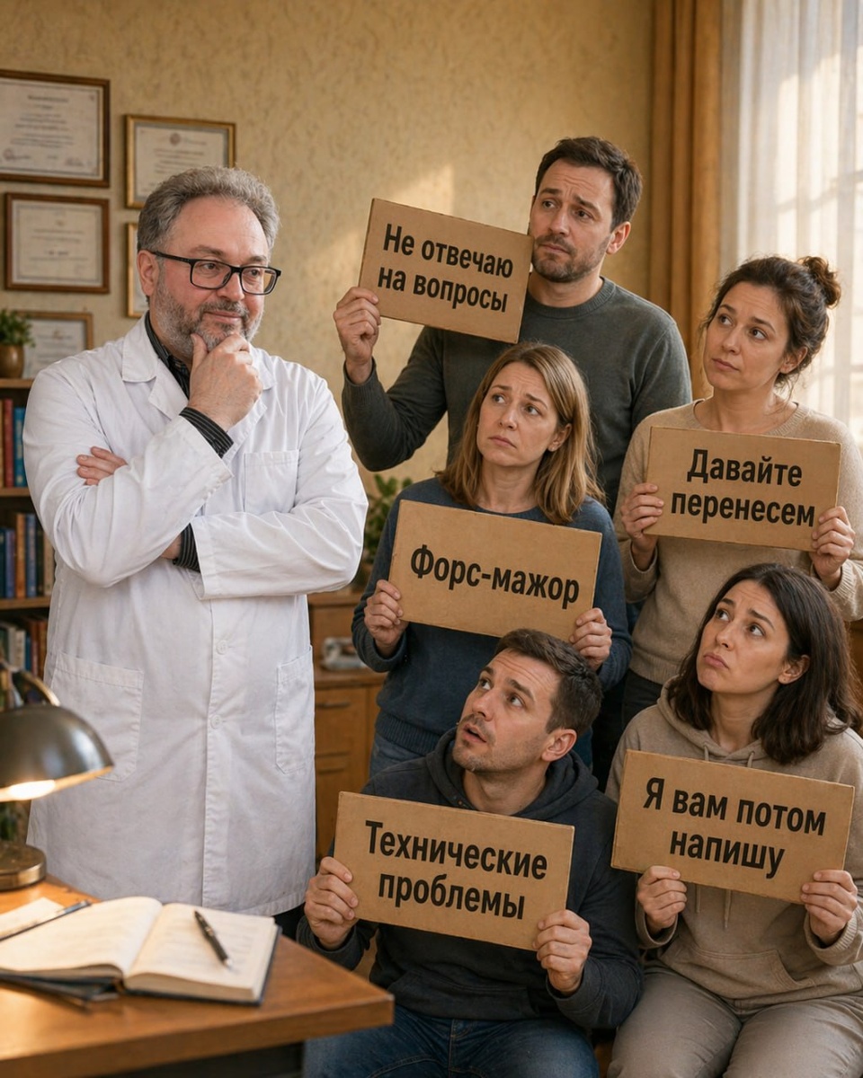 Это не те люди, которые пришли по рекомендации и действительно хотят что-то менять. Это так называемые «новички», которых к врачу привела не внутренняя готовность, а внешнее давление. Жена допилила. Муж поставил ультиматум. Родня устроила "семейный разбор полетов". На работе уже косо смотрят. И вот человек пишет доктору, который, по его смутной фантазии, должен сделать с ним что-то такое, чтобы жизнь изменилась, а привычки менять не пришлось. То есть формально человек «обратился за помощью». А по сути находится примерно там, что у Прохаски называется стадией размышления. Он еще не решил меняться. Он лишь думает о том, что, возможно, когда-нибудь, наверное, стоило бы задуматься. И даже это не точно. Но выглядит все, конечно, иначе. Снаружи это подается как поиск лечения. А внутри заинтересованность в реальных изменениях околонулевая. И эту нулевую заинтересованность человек часто пытается аккуратно замаскировать. Обычно маскировка выглядит так. 1. Не отвечать на вопросы. Человеку
