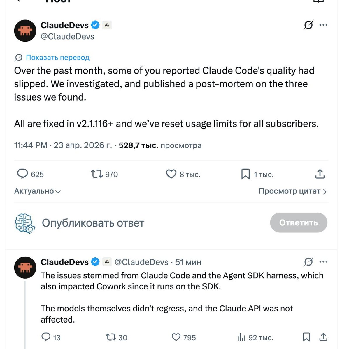 Целый месяц разработчики жаловались: Claude Code стал хуже писать код, тормозит, ломает то, что раньше делал с закрытыми глазами. Anthropic сначала отмалчивались, как это обычно и бывает у больших лабораторий. Но вчера вечером команда ClaudeDevs выкатила пост-мортем и признала: да, проблема была, мы её нашли, мы её починили. Интересно, что дело оказалось не в самой модели. По словам Anthropic, регрессии в Claude не было, API тоже работал штатно. Сломались три вещи внутри обвязки Claude Code и Agent SDK, на котором ещё сидит Cowork, поэтому ему тоже прилетело. Конкретные баги спрятаны в пост-мортеме на сайте Anthropic, но суть в том, что пользователи месяц страдали из-за харнесса, а не из-за мозгов модели. Фикс раскатали в версии 2.1.116 и выше, лимиты использования обнулили всем подписчикам, то есть по сути подарили ещё один цикл квоты. Плюс пообещали изменить внутренние процессы: больше догфудинга с теми же конфигами, что у реальных юзеров, и расширенный набор эвалов, которые будут