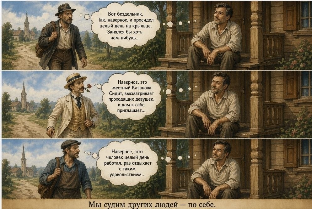 🤎🤎🤎🤎🤎🤎 🌺🌺🌺🌺🌺🌺🌺🌺 Мимо по дороге шел путник. Глядя на ничего не делающего человека, путник подумал: — Вот бездельник. Так, наверное, и просидел целый день на крыльце. Занялся бы хоть чем-нибудь… Спустя время по дороге шел другой путник. Он увидел человека, сидевшего на крыльце, и подумал: — Наверное, это местный Казанова. Сидит, высматривает проходящих девушек, в дом к себе приглашает… Следом шел третий путник. Он посмотрел на сидевшего на крыльце человека и подумал: — Наверное, этот человек целый день работал, раз отдыхает с таким удовольствием… Кто был этот человек, который сидел на крылечке? Мы не знаем. Из притчи о нем совсем ничего не известно. Молод ли он, стар, как выглядит… Зато мы можем кое-что сказать о тех людях, которые проходили мимо. Первый, наверное, был ленивым человеком. Пусть даже не совсем лентяем. Он обрадовался, что есть кто-то более ленивый, чем он сам. Второй, скорее всего, был бабником. А третий, наверняка, был трудолюбивым человеком. Возможно,