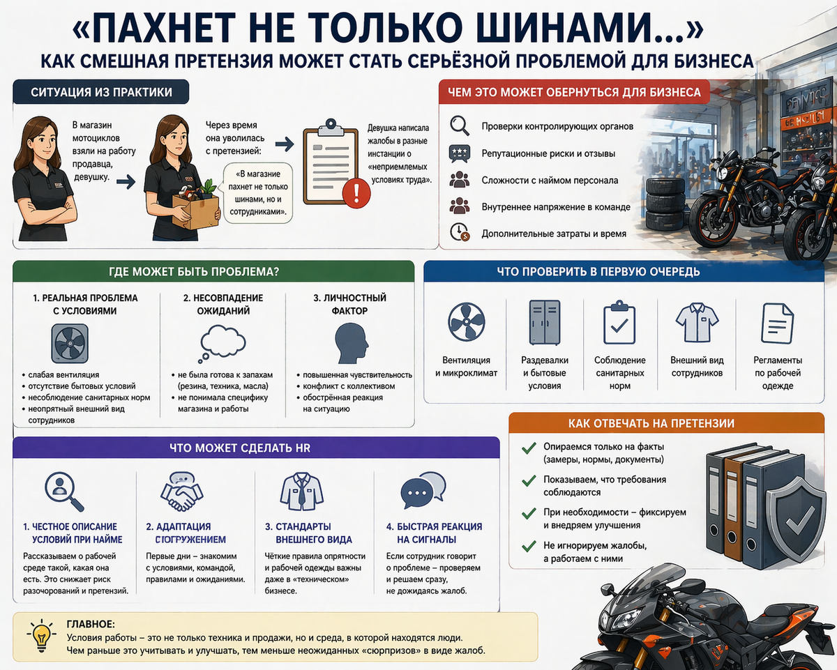 это зона, которую часто недооценивают. Важно отделить эмоции от фактов. Возможны три сценария: В этом случае жалоба — сигнал. Человек не был готов к: И это уже ошибка на этапе подбора. Иногда причина не в условиях, а в восприятии: Но даже в этом случае последствия остаются для бизнеса. Если отбросить эмоции, есть базовый чек-лист: Если здесь есть пробелы —