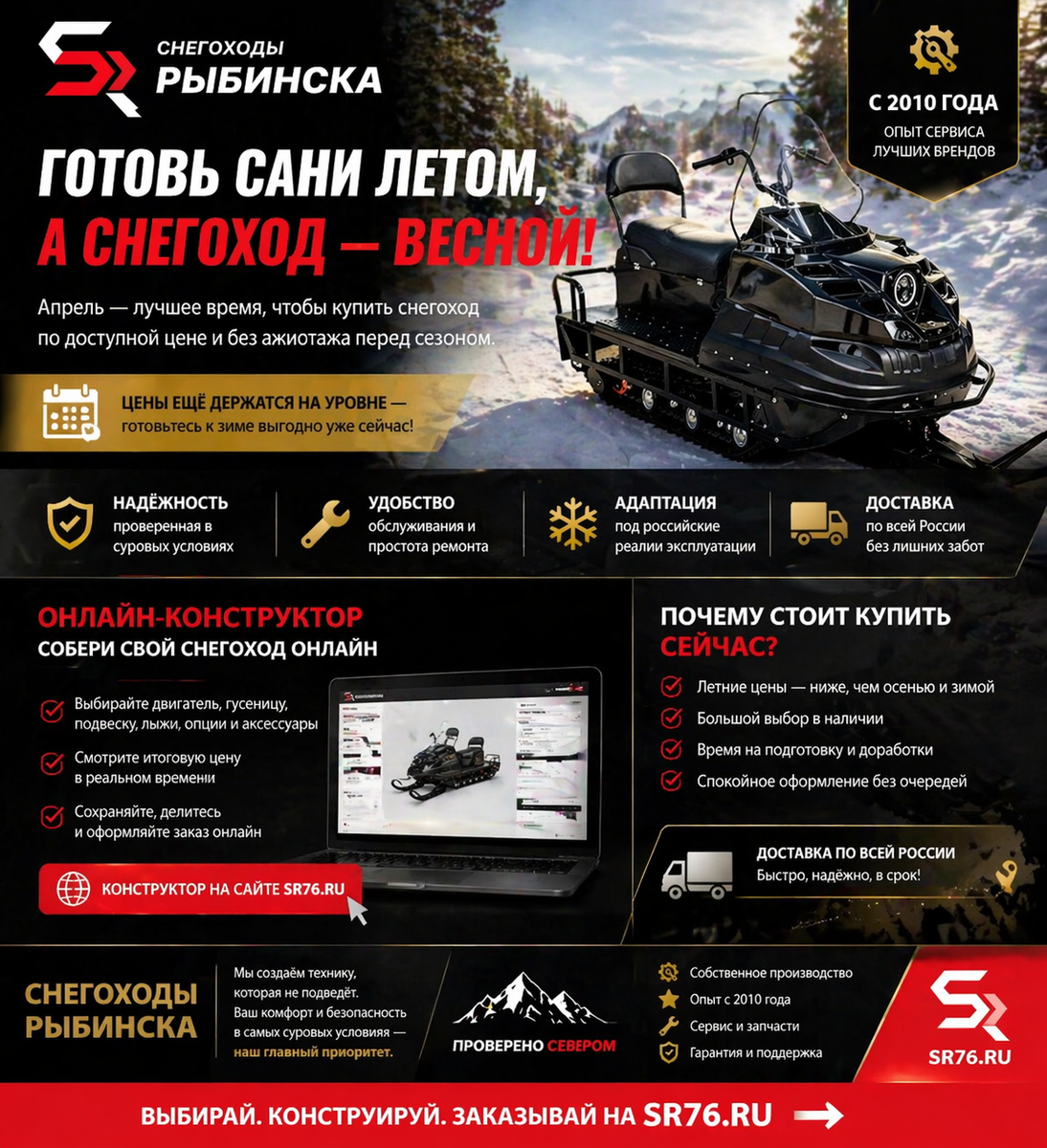 Не ждите снега! Подготовьтесь к зиме уже сейчас с «СНЕГОХОДЫ РЫБИНСКА» и создайте снегоход своей мечты с помощью нашего онлайн-конструктора.