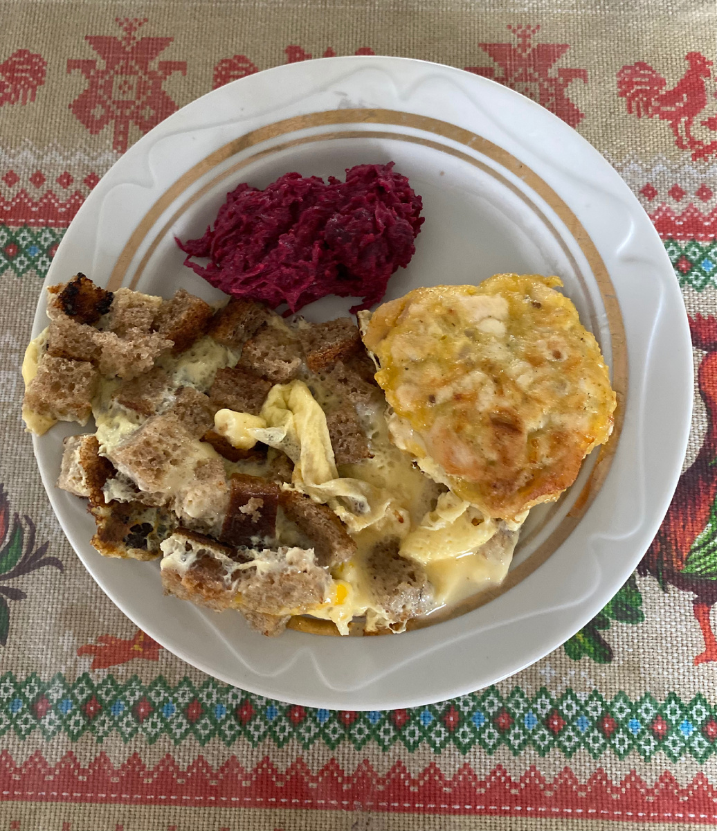 Завтрак- нарезала сухариков из хлеба, обжарила, залила яйцом и разогрела котлету, осталась с ужина. Свекольный салат.