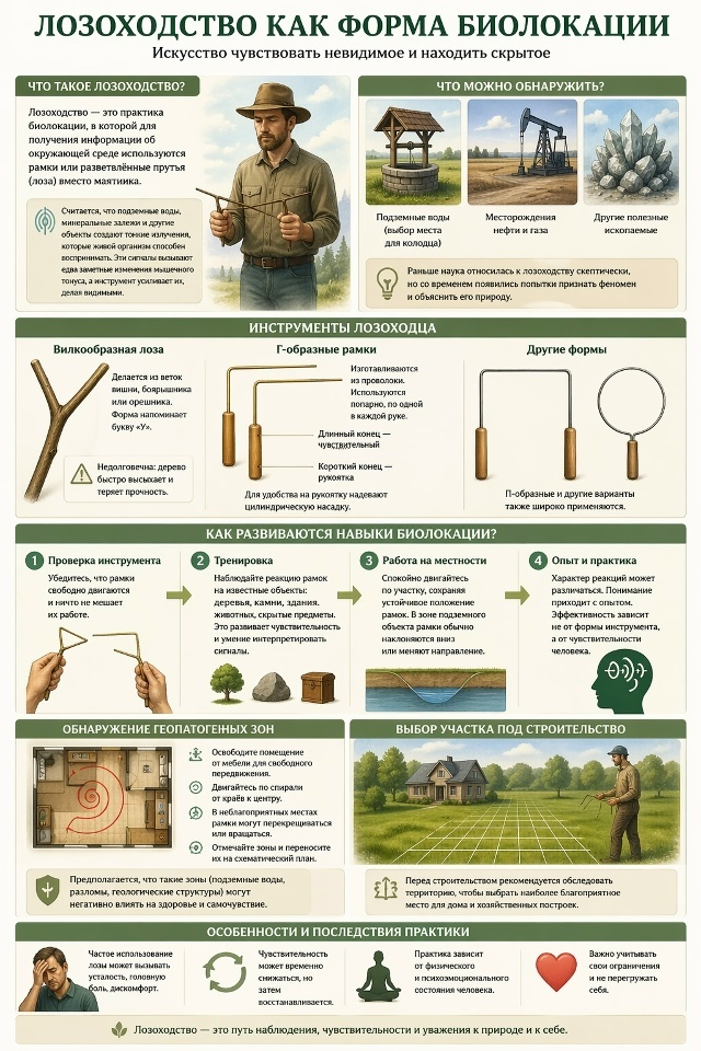 В последние годы представление о биолокации заметно расширилось и уже не ограничивается использованием маятника. Одним из направлений этой практики считается лозоходство, где вместо маятника применяются специальные рамки или разветвлённые прутья. По сути, любой гибкий стержень или изогнутая проволока способны служить инструментом, преобразующим неосознаваемую информацию в заметные визуальные сигналы. С помощью таких индикаторов пытаются определить места залегания подземных вод, чтобы выбрать участок для колодца, а также выявляют месторождения нефти и других полезных ископаемых. Если раньше научное сообщество относилось к лозоходству скептически, то со временем появились попытки не только признать сам феномен, но и объяснить его природу. Предполагается, что вода или минеральные залежи создают некое невидимое излучение, воспринимаемое живыми организмами. Это восприятие выражается, например, в едва заметных изменениях мышечного тонуса, а рамка или лоза лишь усиливают эти реакции, делая их
