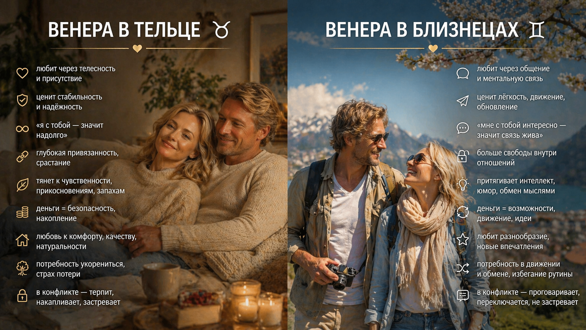 Переход Венеры в другой знак Зодиака отражается на том, как мы любим, чего хотим и что считаем ценным. В этот период мы выбираем отношения не только по критериям надежности и телесной близости, но по качеству ментального контакта. Становится очень важным: интересно ли нам вместе, есть ли между нами диалог, приносит ли каждый следующий день в наши отношения новизну, которая объединяет. Притягивают люди лёгкие в общении, живые, думающие, разделяющие мои интересы и увлечения. Связь с партнерами держится не на "надо", а на "мне с тобой интересно сейчас". Любовь ярче ощущается через: контакт, диалог, отклик. То, что раньше привлекало надежностью, кажется "днем сурка". Становится сложнее находиться в тяжелых "залипающих" отношениях. Хочется отодвинуться подальше от тех, кто "грузит" переживаниями. Это не про поверхностность. Это про свободу внутри отношений, отсутствие слишком плотного "срастания", возможность быть вместе и при этом не замыкаться друг на друге. "Воздух" в чувствах меняет э