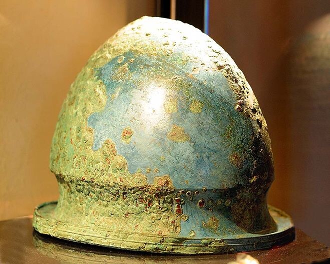 В мире античного оружия есть один шлем, который заслуживает особого внимания, — этрусский. Сами этруски называли его словом cassis. И это не просто историческая деталь: именно от этого термина произошло знакомое всем слово «каска». Так что любой современный защитный головной убор, от строительного до военного, косвенно обязан своим именем древней цивилизации. Этруски жили на территории современной Италии задолго до расцвета Рима и успели многое перенять у греков, а кое-что придумать сами. Их военное дело было весьма развитым, и римляне, которые в итоге завоевали этрусские города, охотно брали у соседей на вооружение не только идеи, но и предметы. Этрусский шлем — как раз такой случай. Главная особенность этих шлемов в том, что их чаще всего отливали из бронзы, а не выковывали из листа металла. По форме они чем-то напоминали современные каски: гладкие, округлые, закрывающие макушку и спускающиеся к ушам. Некоторые типы имели небольшие нащёчники или гребни, другие были совсем простыми, б