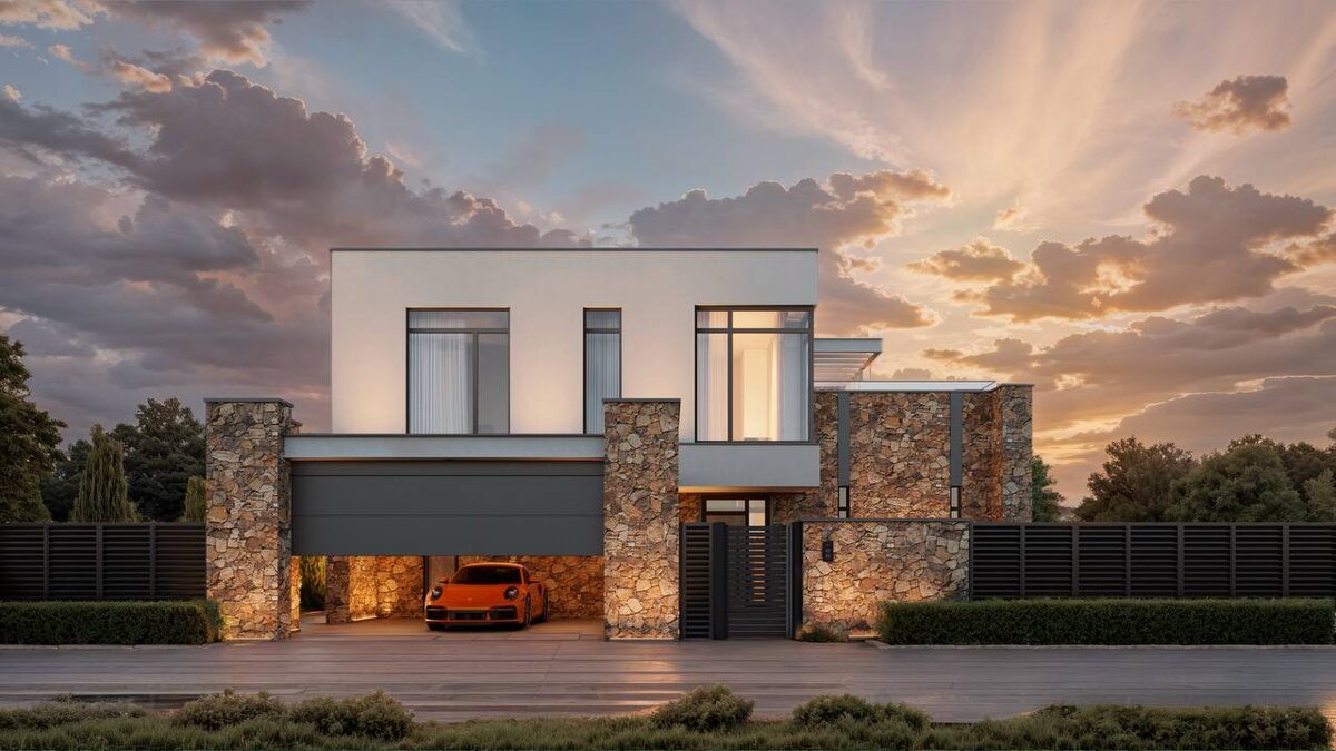 📐 Секрет этого стильного фасада — в грамотном сочетании материалов и строгой геометрии (листайте карусель 👉). Что делает этот дом таким притягательным? 🪨 Контрастная отделка Первый этаж и массивные колонны гаража облицованы диким камнем. Это придает дому статусность, надежность и брутальный характер. Чтобы дом не казался слишком тяжелым, второй этаж выполнен гладкой светлой штукатуркой. Идеальный баланс! 🪟 Угловые окна Настоящая изюминка проекта. Панорамные и угловые окна с темным профилем не только подчеркивают современный стиль (хай-тек/минимализм), но и стирают границы между комнатой и улицей. Внутри всегда будет максимум естественного света ☀️ 🚗 Интегрированный навес Органично вписан в архитектуру дома и подчеркнут эффектной фасадной подсветкой. Строгие линии, плоская кровля и премиальные материалы — это дом для тех, кто ценит современную эстетику и комфорт. Мы строим такие проекты под ключ: от заливки фундамента до финишной отделки фасада.✅