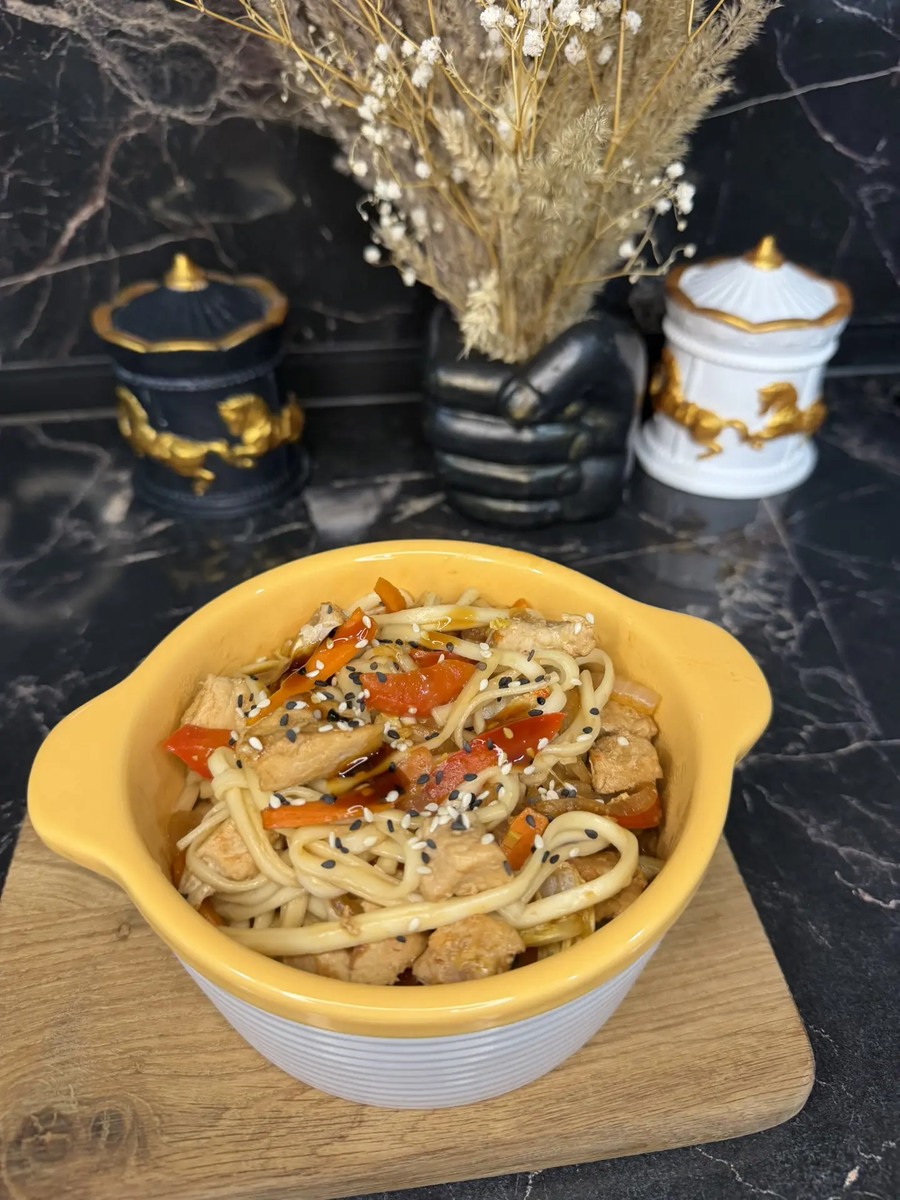 Лапша удон с курицей и овощами - новый взгляд на классику. Ингредиенты: - Куриное филе — 450 г. - Лапша удон — 120 г. - Пекинская капуста — 60 г. - Болгарский перец — 50 г. - Морковь — 30 г. - Кабачок — 50 г (по желанию). - Лук репчатый — 1 средняя головка. - Соль, свежемолотый перец, сушёный чеснок — по вкусу. - Соевый соус — 25 мл. - Соус терияки — 15 г. - Кунжут — для украшения. Пошаговое приготовление: 1. Подготовка продуктов Куриное филе нарежьте аккуратными брусочками. Овощи (капусту, перец, морковь, кабачок, лук) нашинкуйте тонкой соломкой или ломтиками. 2. Обжарка курицы В глубокой сковороде разогрейте немного масла. Обжарьте курицу до золотистой корочки, приправьте солью, перцем и сушёным чесноком. 3. Варка лапши Отварите удон в большом количестве подсоленной воды по инструкции (обычно 4–6 минут). Откиньте на дуршлаг, оставив немного бульона для сочности. 4. Соединение овощей и курицы К обжаренной курице добавьте все подготовленные овощи. Готовьте на среднем огне 4–5 минут, ч