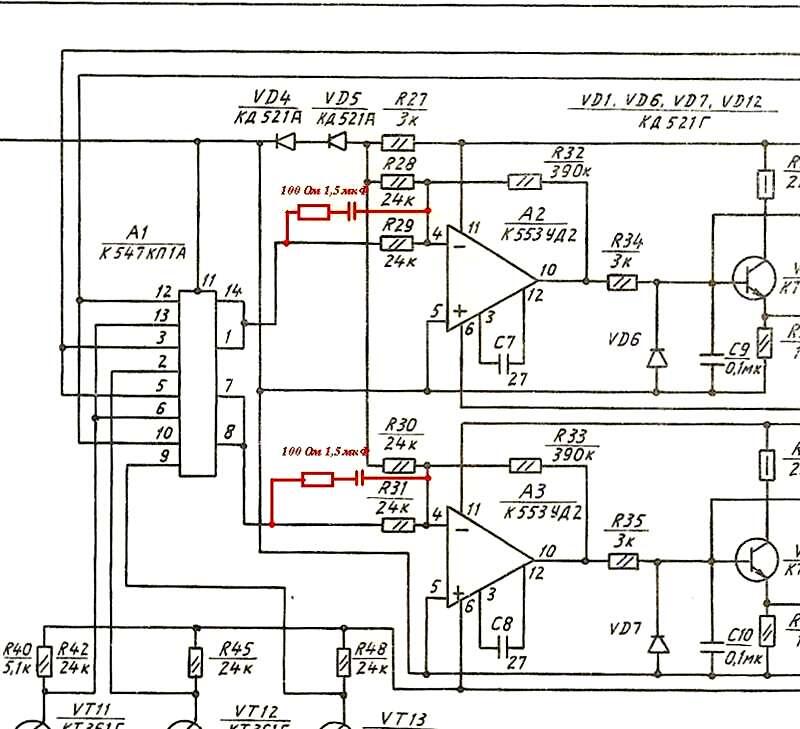 Несколько слов про "Электронное демпфирование". Почему-то в Олимпах оно есть, а вот в Электрониках нет? Причины мне не известны, но! Если в БУ Эльки добавить четыре детали, то произойдёт коррекция фазовой характеристики на опережение и САР магнитофона станет работать корректнее. Без данных деталей система склонна к колебаниям, а с ними колебательные процессы стремятся к апериодичности.