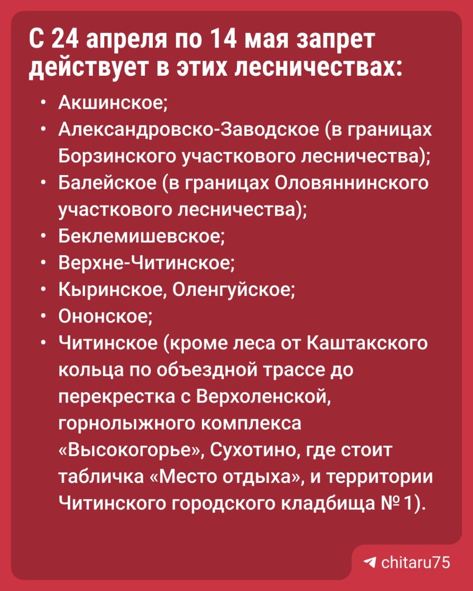 Постановление выпустили на сайте правовых актов.⬆️ Для входа в лес нужно выписывать пропуска в управлении лесничествами Забайкалья по согласованию с местными администрациями при проезде к дому через дороги, относящимся к землям лесного фонда. Штрафы за нарушение правил пожарной безопасности: 🟦для граждан — 40–50 тысяч рублей; 🟦для должностных лиц — 60–90 тысяч рублей; 🟦для организаций — 600 тысяч до 1 млн рублей. Поджигателям грозит до 10 лет колонии. За их поимку в Забайкалье обещают награду в 250 тысяч рублей, а за информацию о поджигателе — 150 тысяч рублей. 📞Если увидели пожар или дым, звоните по номерам: 101, 102, в региональную диспетчерскую службу: 20-36-11, по номеру лесной охраны: 8 800 100-94-00, круглосуточно. 🟦 «Чита.Ру» в MAX | Предложить новость