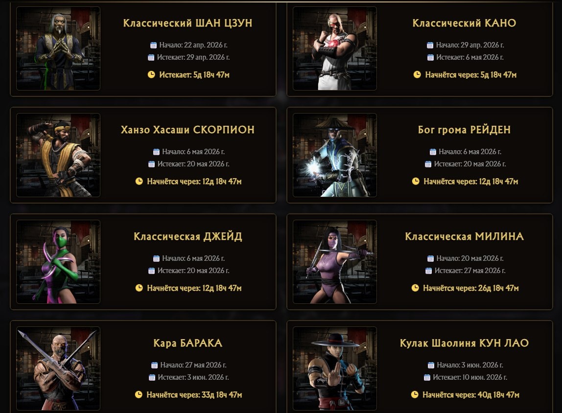 Расписание испытаний до 10 июн. 2026 г. ➡️ Классический ШАН ЦЗУН начало: 2026-04-22 конец: 2026-04-29 ➡️Классический КАНО начало: 2026-04-29 конец: 2026-05-06 ➡️Ханзо Хасаши СКОРПИОН начало: 2026-05-06 конец: 2026-05-20 ➡️Бог грома РЕЙДЕН начало: 2026-05-06 конец: 2026-05-20 ➡️ Классическая ДЖЕЙД начало: 2026-05-06 конец: 2026-05-20 ➡️Классическая МИЛИНА начало: 2026-05-20 конец: 2026-05-27 ➡️ Кара БАРАКА начало: 2026-05-27 конец: 2026-06-03 ➡️ Кулак Шаолиня КУН ЛАО начало: 2026-06-03 конец: 2026-06-10 ❤️ Поддержи лайком. ❤️ ⚫️ Магазин: wb-shop.pro ⚫️ Бот: @mk_mobile_rss_bot ⚫️ Консультант: @antonov1291 ⚫️ Наш тг канал @WB-SHOP.PRO НОВОСТИ Mortal Kombat mobile #MKmobile #WBshop #WBshopPRO