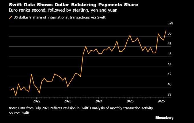 : Februar 2026.: 49,2% Mart 2026.: 51,1%. Ovo je rekord. Dolar je dosegao svoj najveći udio u međunarodnim plaćanjima. Svijet ne zamjenjuje dolar. Gradi više infrastrukture, što zahtijeva dolar. Više američkog LNG-a → više energetske trgovine denominirane u dolarima. Veći rizik od sankcija → veće oslanjanje na dolarske obračune. Veći geopolitički strah → veći priljevi u dolar kao sigurno utočište. Dedolarizacija je smjer, a ne odredište.