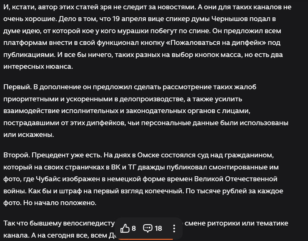 Здравия желаю, граждане сограждане. Продолжение эпопеи про местный блог, который следя за публикациями этого блога резко стал адвокатом дьявола Ткачёва. В этот раз он решил написать про дипфейки которые я якобы пишу. 🤣
