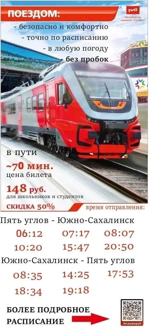 ! В расписании движения поездов пригородного сообщения произошли изменения. Для жителей Корсаковского муниципального округа добавлена остановка «Пристань». Первый утренний пригородный поезд по маршруту Пять углов – Алые розы теперь отправляется на 25 минут раньше - в 6 часов 12 минут. Продлены маршруты двух поездов с новыми начальными станциями Христофоровка – Долинск и двух поездов с новыми начальными станциями Новоалександровка – Пять углов. Подробно ознакомиться с новым расписанием можно на сайте pk-sakhalin.ru, в мобильном приложении «РЖД Пассажирам». АО «Пассажирская компания «Сахалин» 🧒Подписывайтесь на Мой Корсаков в MAX и будьте в курсе событий!