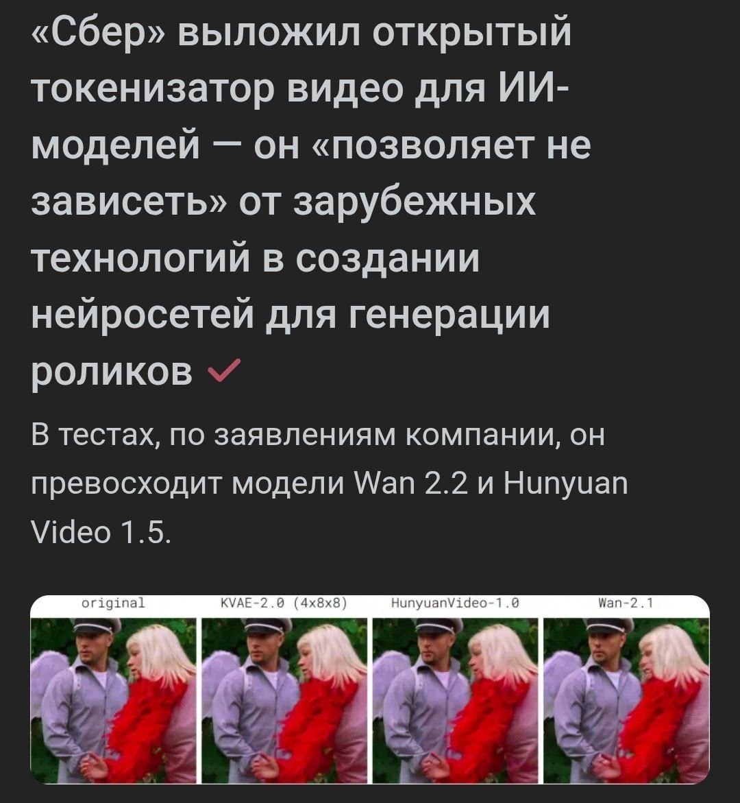 Сбер выкатил открытые токенизаторы KVAE-2.0 — базовая тулза для создания ИИ-моделей уровня Kandinsky в генерации видео 🎬 ▌ Что внутри? • 🎞 Сжатие х4 → ролики занимают в 4 раза меньше места, но на выходе картинка чище и детальнее • 💰 Обучение дешевле → тренировать нейронки с нуля теперь в разы быстрее и экономнее по ресурсам серверов • 🧠 Архитектура KVAE → эффективнее кодирует временные и пространственные связи в видео • 🏆 Обгоняет гигантов → по тестам уже опережает решения от Tencent и Alibaba • 📦 MIT-лицензия → бери, используй, модифицируй — для личных и коммерческих проектов без ограничений ▌ Доступ — свободный → Код в открытом доступе ✅ → Лицензия MIT — никаких скрытых условий ✅ → Совместимость с популярными фреймворками ✅ → Документация и примеры для быстрого старта ✅ ▌ Фишка, которая меняет правила Раньше качественная генерация видео требовала огромных вычислительных мощностей. Теперь можно обучать модели на обычном железе, не продавая почку для аренды кластера 💻💸 ▌ Для