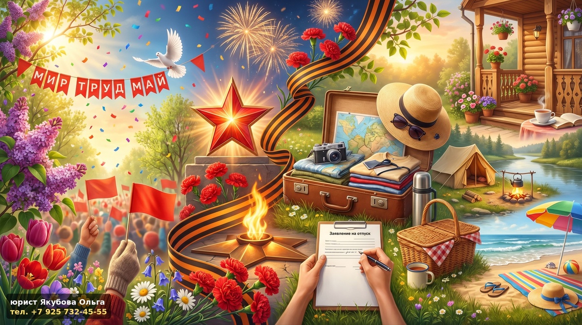 По Трудовому кодексу 1 и 9 мая — нерабочие праздничные дни (ч. 1 ст. 112 ТК РФ). Календарь на май 2026 даёт нам: 1–3 мая — первая трёхдневная «волна» отдыха: пятница (Праздник Весны и Труда), затем суббота и воскресенье. 9–11 мая — вторая трёхдневная «волна»: 9 мая (суббота, День Победы), 10 мая (воскресенье), 11 мая (понедельник, перенесённый день отдыха за 9 мая по ч. 2 ст. 112 ТК РФ). Между ними — полноценная рабочая неделя с 4 по 8 мая, причём 8 мая — сокращённый рабочий день как предпраздничный (ст. 95 ТК РФ). 🏕Как праздники влияют на отпуск и отпускные ☝️Три ключевых правила ТК РФ: 🔹️Ежегодный оплачиваемый отпуск считаётся в календарных днях (ст. 120 ТК РФ). 🔹️Нерабочие праздничные дни внутри отпуска не входят в его продолжительность и продлевают его, но не оплачиваются как отпускные (ч. 1 ст. 120, ч. 1 ст. 112 ТК РФ). 🔹️Обычные выходные и перенесённые выходные (как 11 мая) входят в отпуск, если попадают в период, и оплачиваются как отпускные дни. Отсюда вывод, чтобы прод