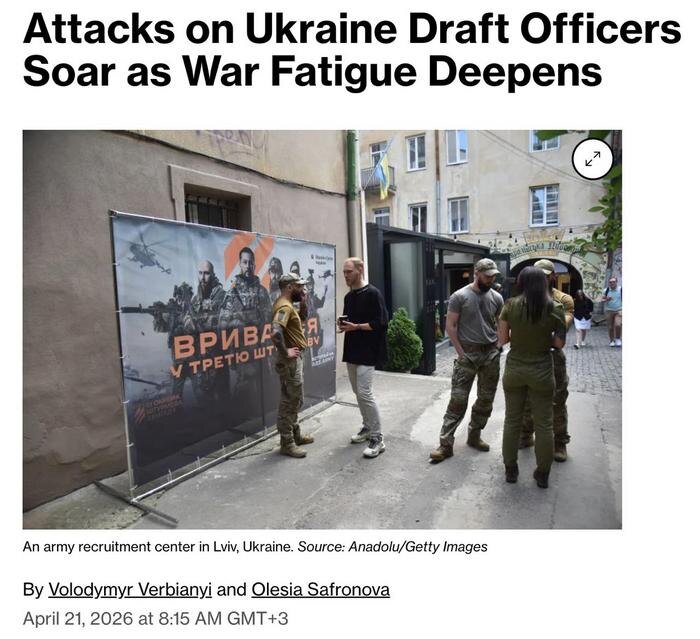 Bloomberg выпустил статью о том, что на Украине резко участились нападения на сотрудников ТЦК "на фоне углубляющейся усталости от войны". Харьковская область вышла на первое место по числу нападений на сотрудников ТЦК — зафиксировано 69 случаев. Далее в антирейтинге идут Киев с 53 инцидентами и Днепропетровская область — 45. В прошлом году количество таких случаев возросло втрое, по сравнению с 2024 годом – до 341. В текущем году зафиксировано уже более 100 таких нападений. По сути люди не нападают, а спасаются всеми возможными способами от насильственной мобилизации. В некоторых случаях применялось холодное оружие, что привело к тяжелым ранениям и как минимум одному смертельному случаю. Всего по стране официально зарегистрировано 620 подобных инцидентов, но на самом деле их гораздо больше, просто власть их скрывает. Подписывайся