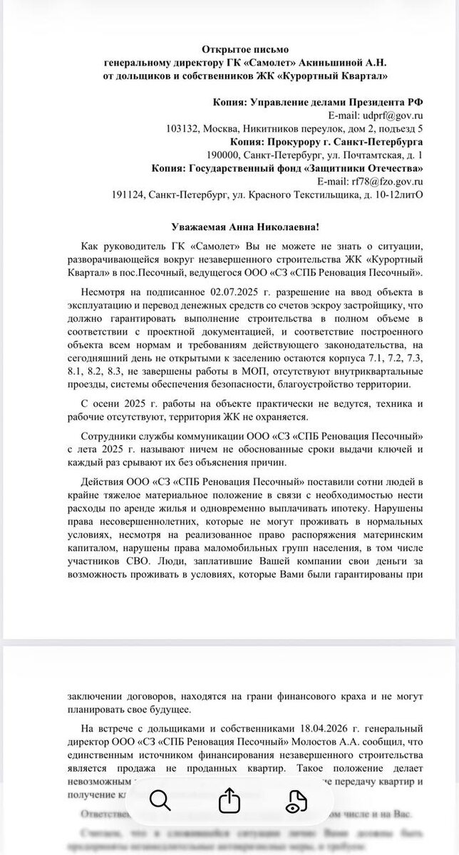 Дольщики ЖК Курортный квартал написали открытое письмо в управление по делам президента
