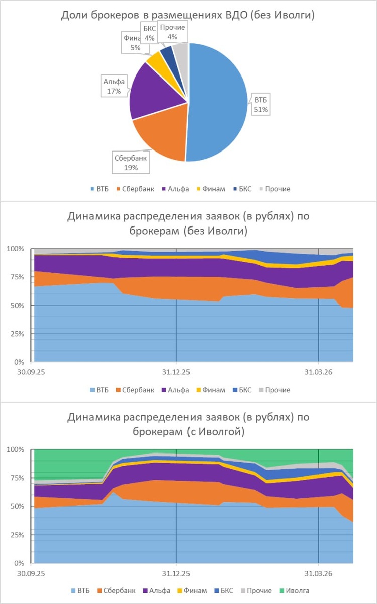 В инфографике приведены размещения ВДО, организатором которых выступала ИК Иволга Капитал. На первой диаграмме – распределение заявок на покупку по внешним брокерам (т.е. без самой Иволги), в рублях, не в штуках, в среднем за последние 5 размещений. На второй и третьей – динамика этого распределения за последние 2,5 квартала. Без учета Иволги и с учетом. На ВТБ, Сбер и Альфу приходится более 80% внешнего спроса в наших ВДО-размещениях. При этом отдельно взятый ВТБ – половина такого спроса. Но, если смотреть в динамике, пусть и короткой, Сбер, Альфа, а также, хоть и с отставанием, Финам и БКС его постепенно теснят. Какая-никакая конкуренция! Телеграм: @AndreyHohrin Не является инвестиционной рекомендацией. Ссылка на ограничение ответственности Следите за нашими новостями в удобном формате: Telegram, Youtube, RuTube, Smart-lab, ВКонтакте, Сайт