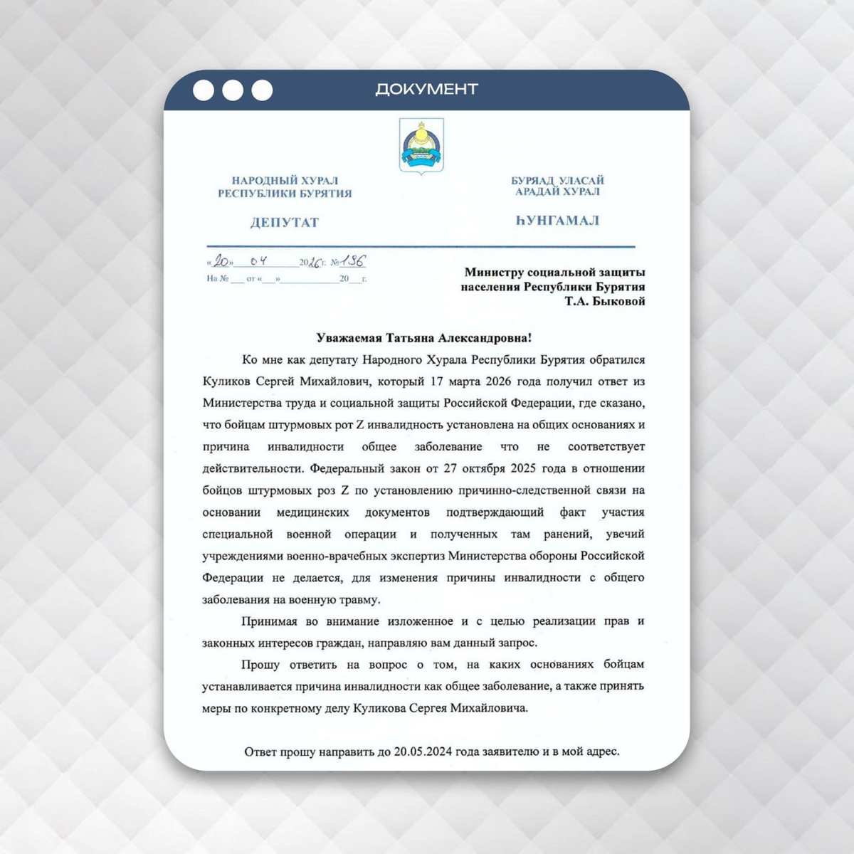 В рамках проекта «Буду жаловаться в ЛДПР» в Бурятии продолжается работа с обращениями граждан, связанными с защитой их прав. К депутату Народного Хурала Республики Бурятия обратился житель региона. Поводом стало несоответствие установленной причины инвалидности фактическим обстоятельствам — речь идёт о бойцах, получивших ранения, но оформленных по категории «общее заболевание». По обращению направлен депутатский запрос в адрес Министерства социальной защиты населения Республики Бурятия. Запрошены разъяснения по основаниям установления причины инвалидности, а также меры по конкретному случаю заявителя. Ситуация взята на контроль. Основная задача - добиться объективного рассмотрения и защиты законных прав граждан.