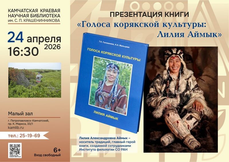 Презентация книги «Голоса корякской культуры: Лилия Аймык» пройдет сегодня в Камчатской краевой научной библиотеке им. С.П. Крашенинникова, передает агентство «КАМЧАТКА-ИНФОРМ» со ссылкой на сообщение библиотеки. Начало 24 апреля в 16:30. Вход свободный. Возрастное ограничение 6+. «В основе книги — бережно записанные, подлинные рассказы Лилии Александровны Аймык, носительницы Пахачинского говора чавчувенского диалекта корякского языка. Это живая речь народа, веками кочевавшего по просторам Севера, сохранившего глубокую связь с природой и верность многовековым обычаям», - говорится в сообщении. На презентации выступит Лилия Аймык — носитель традиций, главный герой книги, созданной сотрудниками Института филологии СО РАН. На презентации выступит Лилия Аймык — носитель традиций, главный герой книги, созданной сотрудниками Института филологии СО РАН. Посетители узнают о том, как создавалась книга, о процессе записи и расшифровки текстов, о содержании книги и её значении, а также смогут
