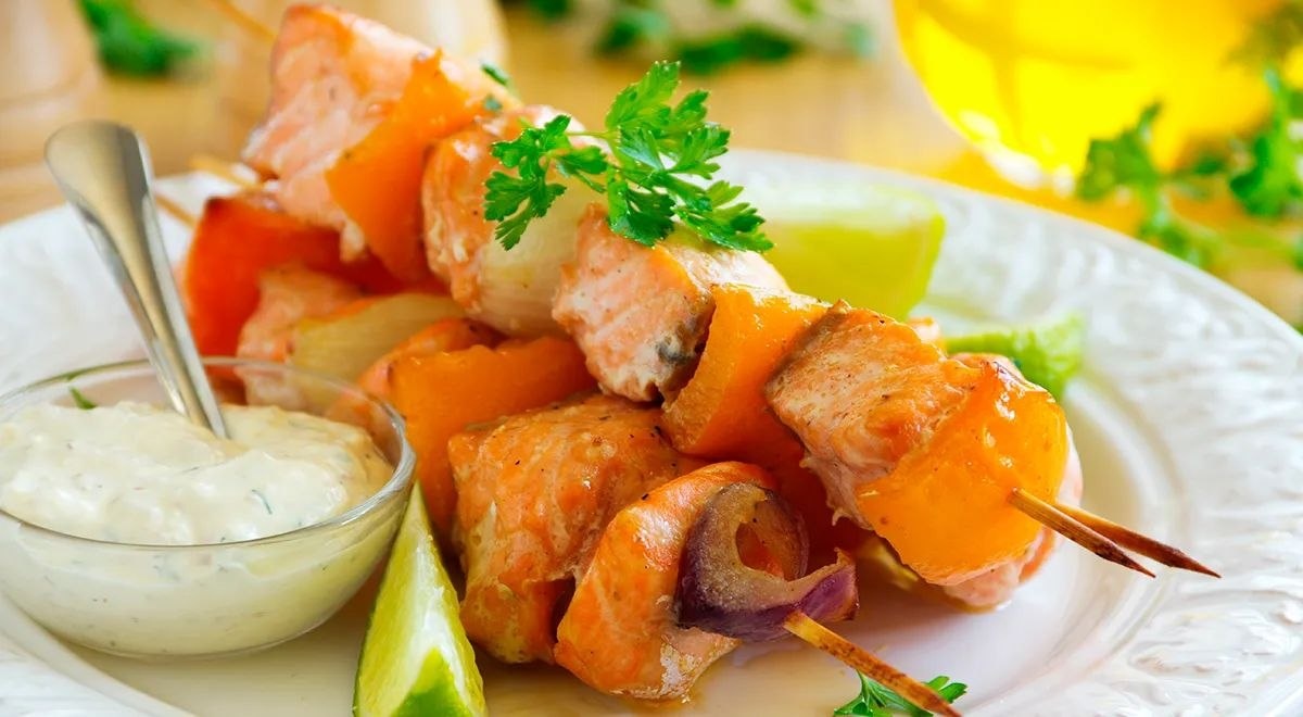 Нежный, сочный, с овощами и лимонно-медовым маринадом — этот рыбный шашлык удивит своим вкусом и опровергнет миф о суховатости кеты. Идеален для духовки, гриля или мангала. 📖 Ингредиенты (на 4 порции): · Кета (филе) — 600 г · Перец сладкий — 1–2 шт. · Лук репчатый — 2 шт. · Масло оливковое — 4 ст. л. · Лимон (цедра и сок) — 1 шт. · Мёд жидкий — 1 ст. л. · Орегано сушёный — 1 ч. л. · Соль, перец — по вкусу 🧑🏻🍳 Приготовление: 1. Подготовка: Деревянные шпажки замочи в воде на 1 час. Филе кеты нарежь крупными кубиками (3–4 см). 2. Маринад: С лимона сними цедру, выжми сок. Смешай оливковое масло, лимонный сок, цедру, мёд, орегано, соль и перец. Залей маринадом рыбу, перемешай. Оставь на 40 минут. 3. Овощи: Лук нарежь кольцами, сладкий перец — квадратиками 3–4 см. 4. Сборка: Нанижи на шпажки кусочки рыбы, чередуя с луком и перцем. 5. Приготовление в духовке: Разогрей духовку до 200°C. На нижний уровень поставь противень для сбора сока. Шпажки выложи на решётку, установи над противне