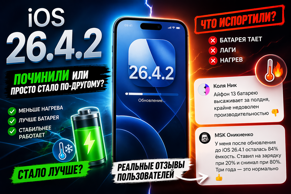 Apple снова выкатила обновление, и снова у пользователей разделились мнения. Причём не просто «кому-то нравится, кому-то нет», а классическое: на одном и том же iPhone у людей абсолютно разный опыт. И если коротко — iOS 26.4.2 получилась именно такой: местами приятной, местами странной, а местами… ну вы поняли. Apple традиционно не спешит раскрывать карты, поэтому список «официальных» изменений выглядит скромно. Но по факту мы видим: 1. Оптимизация энергопотребления (опять) Звучит красиво. На деле — как повезёт. 2. Исправления перегрева 3. Патчи безопасности 4. Микро-правки интерфейса Вот тут начинается самое интересное. Судя по комментариям (и не только вашим), обновление ведёт себя… непоследовательно. Один из подписчиков пишет: «Айфон 13 батарею высаживает за полдня… крайне недоволен» Другой: «Телефон больше не нагревается, заряд перестал падать с бешеной скоростью» И это не единичный случай — таких отзывов десятки. Вот здесь важно понять: это не «кому-то показалось». Причины вполне
