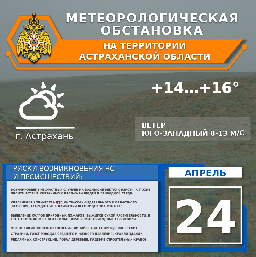 На территории области облачно с прояснениями. Местами кратковременные дожди. Ветер юго-западный, южный 8-13 м/с, по северу порывы 18-23 м/с. Температура воздуха +12...+17°. По г. Астрахань облачно с прояснениями. Слабый дождь. Ветер юго-западный 8-13 м/с. Температура воздуха +14...+16°.