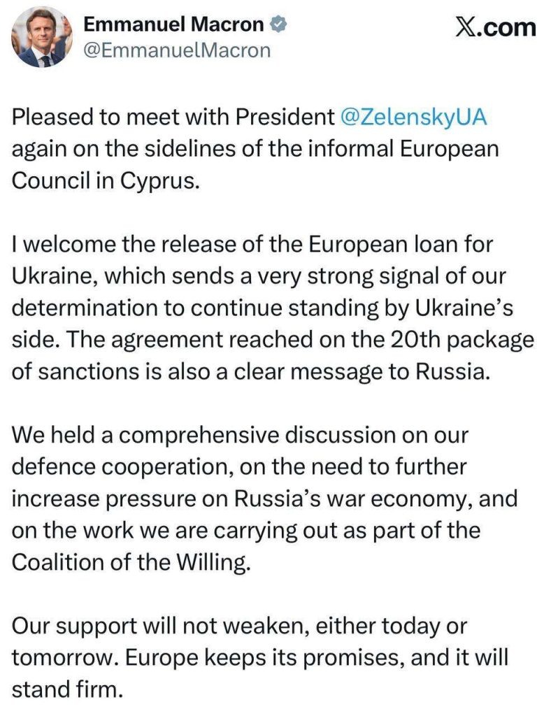 Президент Франции Эмманюэль Макрон прокомментировал принятие нового пакета санкций против России, подчеркнув решимость Европы. «Я приветствую выделение европейского кредита для Украины, что является очень сильным сигналом нашей решимости продолжать стоять плечом к плечу с Украиной. Достигнутое соглашение по 20-му пакету санкций также является четким посланием России» — заявил Макрон. Он также отметил всестороннее обсуждение сотрудничества в области обороны, необходимость дальнейшего усиления давления на военную экономику России и работу в рамках «Коалиции желающих». «Наша поддержка не ослабнет ни сегодня, ни завтра. Европа держит свои обещания и будет стоять твердо», — подытожил Макрон. Ранее мы писали, что Зеленский «чахнет над златом» — глава режима рассказал как будет расходовать кредит ЕС.