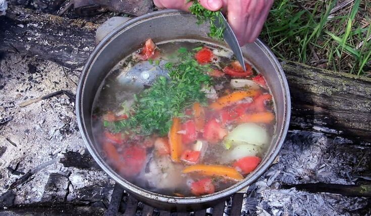 2. Головешка: Окунаем в уху горящую головешку из костра (тлеющий уголёк на палке). Угольки зашипят и потухнут — это даёт тот самый неповторимый аромат костра .