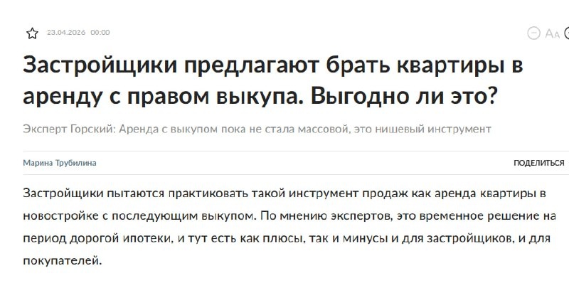 "Π ΠΎΡΡΠΈΠΉΡΠΊΠΎΠΉ ΠΠΈΠ»ΡΠ΄ΠΈΠΈ Π ΠΈΡΠ»ΡΠΎΡΠΎΠ²" ΠΠ³ΠΎΡΡ ΠΠΎΡΡΠΊΠΈΠΉ. ΠΡΠ΅Π½Π΄Π° Ρ Π²ΡΠΊΡΠΏΠΎΠΌ Π½Π°ΡΠ°Π»Π° ΠΏΠΎΡΠ²Π»ΡΡΡΡΡ Ρ ΡΡΠ΄Π° Π·Π°ΡΡΡΠΎΠΉΡΠΈΠΊΠΎΠ², Π½ΠΎ ΠΏΠΎΠΊΠ° ΡΡΠΎ Π½Π΅ ΠΌΠ°ΡΡΠΎΠ²ΡΠΉ ΡΡΠ΅Π½Π΄, Π° Π½ΠΈΡΠ΅Π²ΡΠΉ ΠΈΠ½ΡΡΡΡΠΌΠ΅Π½Ρ. Π ΠΎΠ΄Π½ΠΎΠΉ ΠΊΠΎΠΌΠΏΠ°Π½ΠΈΠΈ, ΡΠ°ΡΡΠΊΠ°Π·ΡΠ²Π°Π΅Ρ ΠΠΎΡΡΠΊΠΈΠΉ, ΠΊΠ»ΠΈΠ΅Π½ΡΡ Π² 100% ΡΠ»ΡΡΠ°Π΅Π² Π²ΡΠ±ΠΈΡΠ°Π»ΠΈ Π±ΠΎΠ»Π΅Π΅ ΠΏΡΠΈΠ²ΡΡΠ½ΡΠΉ ΠΏΡΠ΅Π΄Π²Π°ΡΠΈΡΠ΅Π»ΡΠ½ΡΠΉ Π΄ΠΎΠ³ΠΎΠ²ΠΎΡ ΠΊΡΠΏΠ»ΠΈ-ΠΏΡΠΎΠ΄Π°ΠΆΠΈ, Π° Π½Π΅ Π°ΡΠ΅Π½Π΄Ρ Ρ Π²ΡΠΊΡΠΏΠΎΠΌ. Π Π΄ΡΡΠ³ΠΎΠΉ, Π½Π°ΠΏΡΠΎΡΠΈΠ², Π²ΡΠ΅ 26 ΠΊΠ²Π°ΡΡΠΈΡ, ΠΏΡΠ΅Π΄Π»ΠΎΠΆΠ΅Π½Π½ΡΠ΅ ΠΏΠΎ ΡΠ°ΠΊΠΎΠΉ ΠΌΠΎΠ΄Π΅Π»ΠΈ, Π±ΡΠ»ΠΈ ΡΠ°Π·ΠΎΠ±ΡΠ°Π½Ρ ΠΊΠ»ΠΈΠ΅Π½ΡΠ°ΠΌΠΈ Π·Π° ΠΏΠΎΠ»ΡΠΎΡΠ° Π΄Π½Ρ, ΠΏΡΠΈ ΡΡΠΎΠΌ ΠΎΠΆΠΈΠ΄Π°Π΅ΠΌΡΠΉ Π²ΡΠΊΡΠΏ - 75-80%. ΠΠΎ Π²ΡΠ΅ ΠΆΠ΅ Π² ΡΠ΅Π»ΠΎΠΌ ΡΠ°ΠΊΠΈΠ΅ ΡΠ΄Π΅Π»ΠΊΠΈ ΠΏΠΎΠΊΠ° Π΅Π΄ΠΈΠ½ΠΈΡΠ½Ρ, ΠΏΠΎΠ΄ΡΠ΅ΡΠΊΠ½ΡΠ» ΡΠΊΡΠΏΠ΅ΡΡ. #ΠΏΡΠ΅ΡΡΡΠ΅Π½ΡΡΠ ΠΠ
