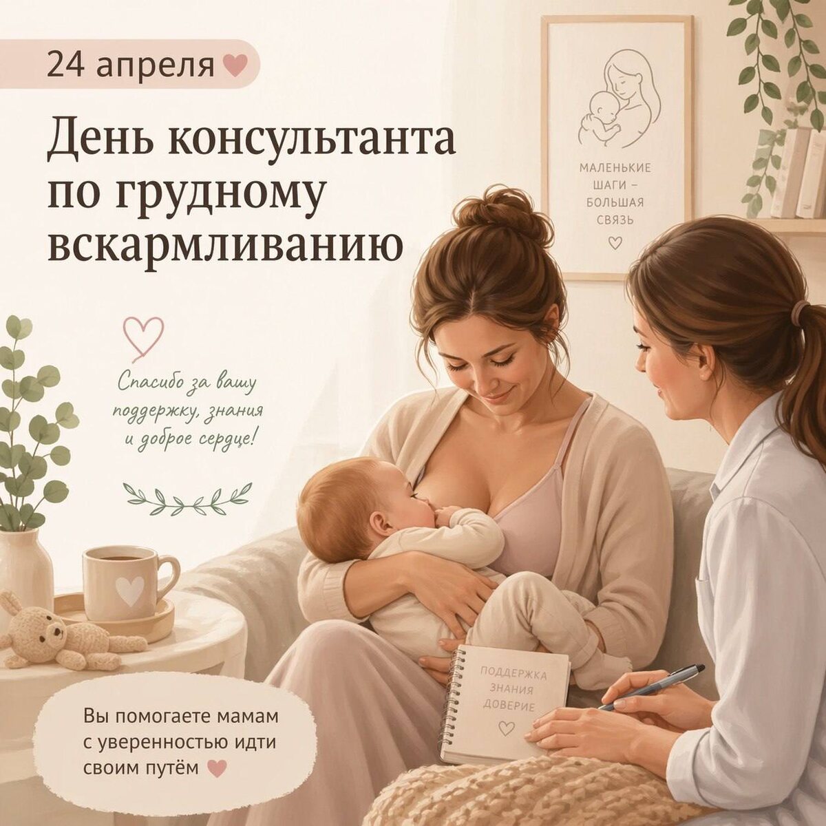 ! Сегодня наш день — день тех, кто умеет быть рядом не только знаниями, но и сердцем. Тех, кто приходит туда, где много тревоги, усталости, слёз, вопросов… и помогает появиться уверенности, спокойствию и вере в себя. Быть консультантом по грудному вскармливанию — это не просто профессия. Это труд, в котором важны и опыт, и терпение, и чуткость, и умение видеть за вопросом про прикладывание живую женщину, которой сейчас очень нужна опора. Я в этой профессии уже 22 года — и всё это время не перестаю восхищаться тем, сколько в нашем сообществе силы, мудрости и настоящей человечности. Мы не просто помогаем наладить кормление. Мы часто помогаем маме выдохнуть, поверить в себя и почувствовать: она справляется. Спасибо каждой из вас за ваш труд, за ваше большое сердце, за бесконечное обучение, за поддержку семей и за то, что вы есть. Пусть будет меньше выгорания, больше благодарных историй, тёплых встреч, профессионального роста и радости от того, что вы делаете. С праздником нас, дорогие кол