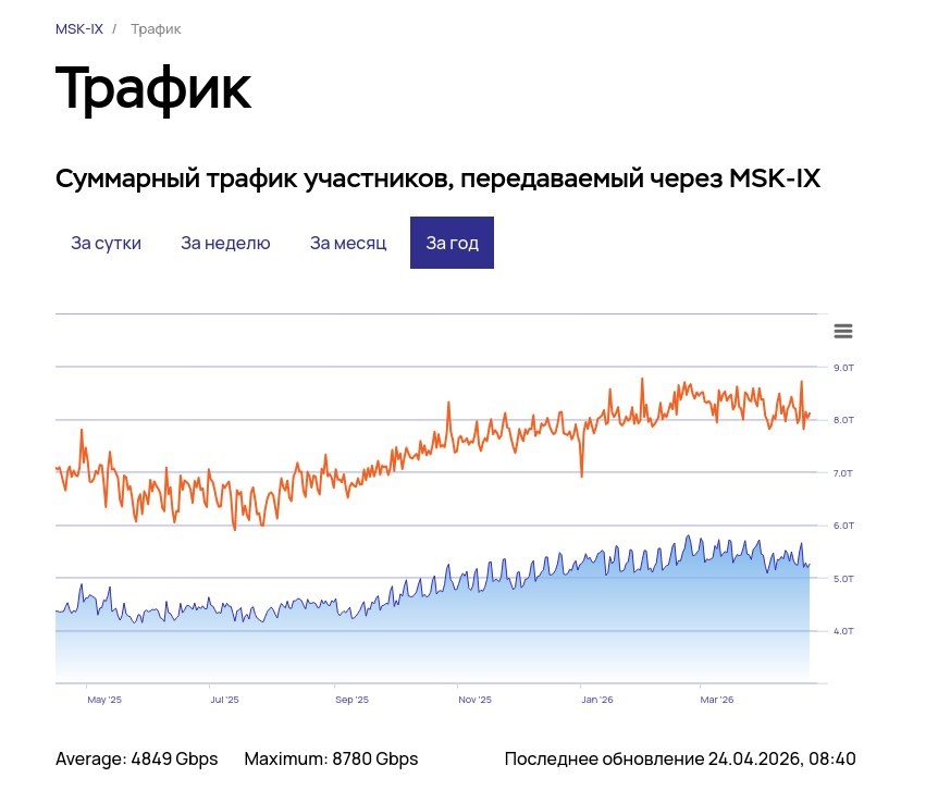 Вырос на 15-20% за 2025 год. По данным IT-компаний и точек обмена трафиком, его доля в Рунете сейчас составляет около 30%. Тренд на увеличение объёмов иностранного трафика продолжается.