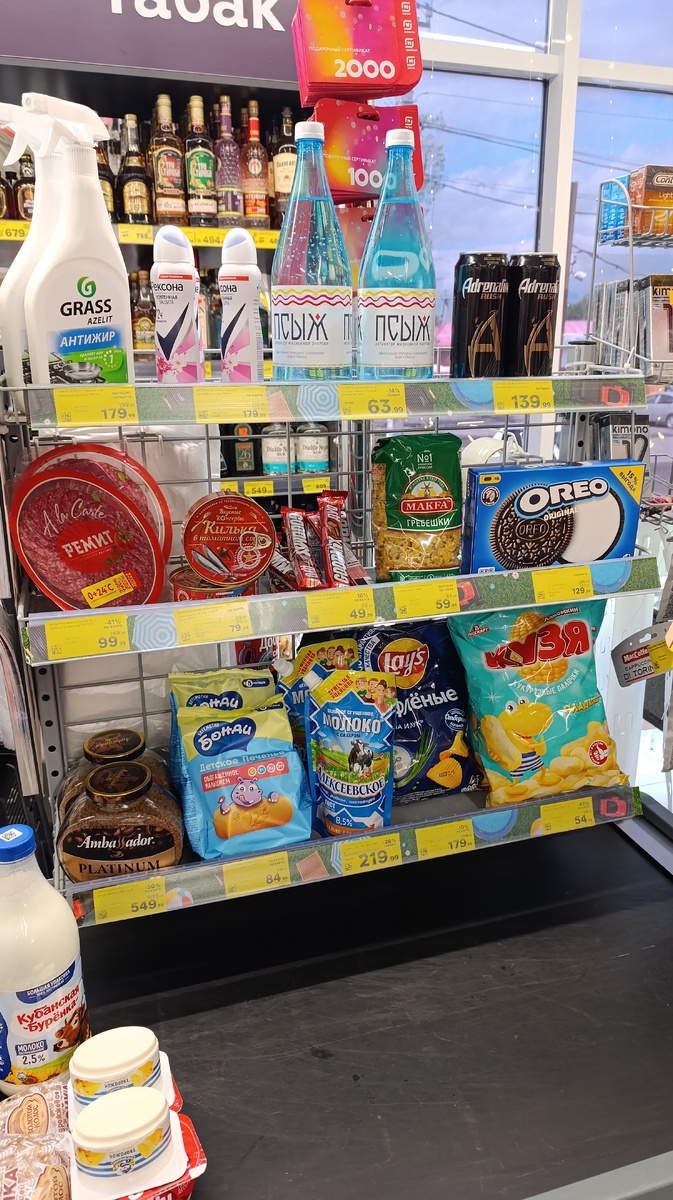 Покажу вам витрину с товарами со скидкой у кассы в Магните у дома.