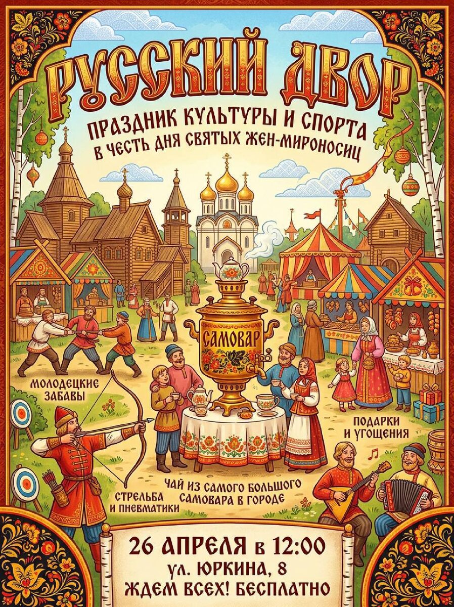 »! «Русский двор» - это праздник для всей семьи 🎉 📍 Ждём вас 26 апреля в 12:00 Адрес: ул. Юркина, 8 Приходите всей семьёй - проведём этот день вместе, по-доброму и по-настоящему. Для вас будут угощения, горячий чай из самовара, игры и другие забавы. Детей развлекут аниматоры и ростовые куклы 🧸 ❗ Вход свободный ВКонтакте | Официальный сайт | Русская община в МАХ