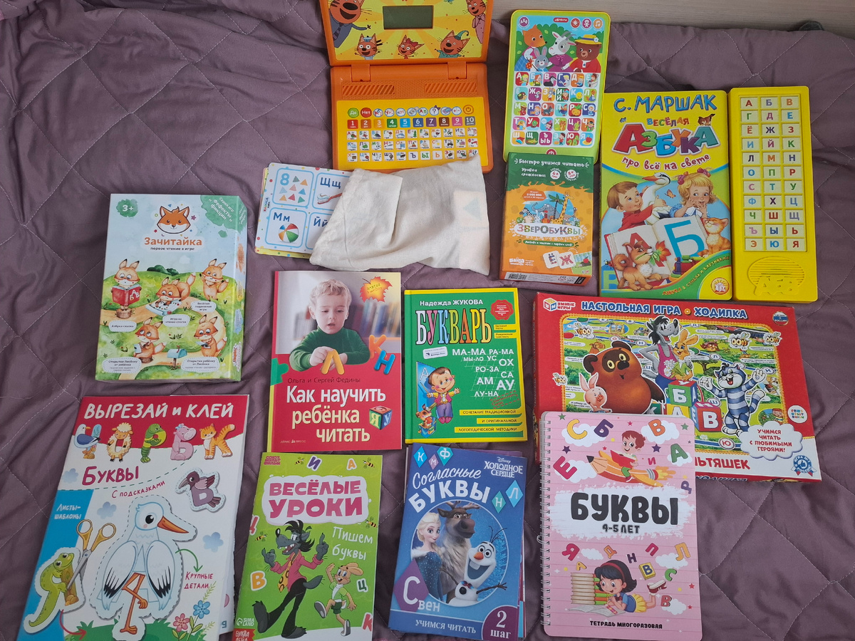 Что мы имеем: кучу книг и гаджетов для обучения буквам и чтению, и ребенка 4.5 лет, который пока еще не читает, несмотря на вот это все😁