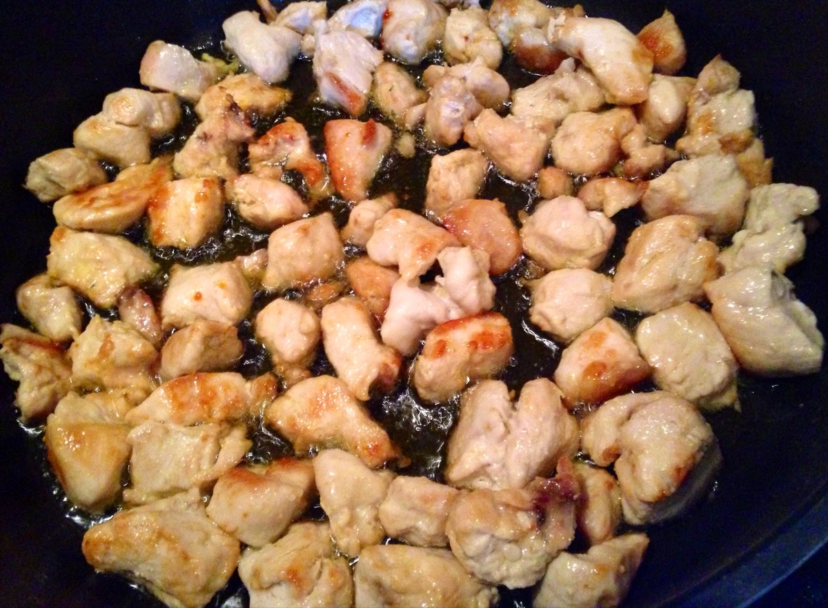 - Куриное филе нарежьте небольшими кубиками (примерно 2×2 см)