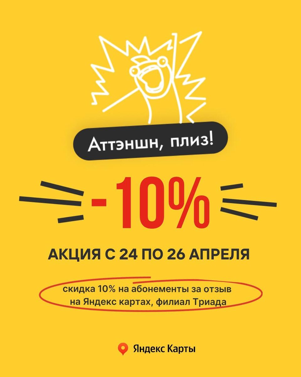 ! 😃 Друзья, мы знаем, как важно делиться своими впечатлениями и эмоциями. Особенно если это касается чего-то, что вы действительно любите! Именно поэтому мы решили запустить акцию, которая поможет вам сэкономить и сделать наш клуб ещё популярнее 🥰. Что Мы Предлагаем? 💙 Оставьте отзыв о нашем филиале в центре "Триада" в Яндекс Картах (действует только на этот филиал) и получите скидку 10% на следующий абонемент. Это действительно выгодное предложение! Например, если вы выберете абонемент на 12 занятий, ваша скидка составит 2 260 рублей! 💥Условия Акции - оставьте отзыв на Яндекс Картах о филиале Триада. (ссылка в комментариях под этим постом) - пришлите скриншот вашего отзыва менеджеру в Бот ТГ. - Выберете месячный абонемент. Скидка распространяется только на абонементы сроком действия в месяц. Не упустите возможность — акция действует до 26 апреля включительно! Оставить отзывам и произвести оплату абонемента необходимо до 26.04.26.