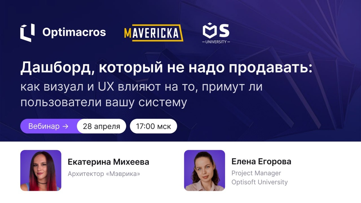 Но не менее важен и дизайн: если интерфейс неудобный или перегруженный, пользователи просто не будут в нем работать. Как создавать дашборды, которыми пользуются с удовольствием? Узнайте на совместном вебинаре OptiSoft University и «Мэврика» — «Дашборд, который не надо продавать: как визуал и UX влияют на то, примут ли пользователи вашу систему». Когда: 28 апреля в 17:00 мск На вебинаре вы узнаете: 💌почему пользователи саботирую систему, и что с этим делать; 💌как визуал влияет на принятие системы, и почему он важен не меньше, чем правильная логика; 💌5 базовых правил дизайна, и как они работают в Optimacros. 👉 Зарегистрироваться _______________________ Организатор оставляет за собой право модерации участников. #OM_вебинары #ОМ_партнеры #UX #Optimacros 👍 Присоединяйтесь к нам на других площадках: MAX | Дзен | LinkedIn | Хабр | VC | RuTube