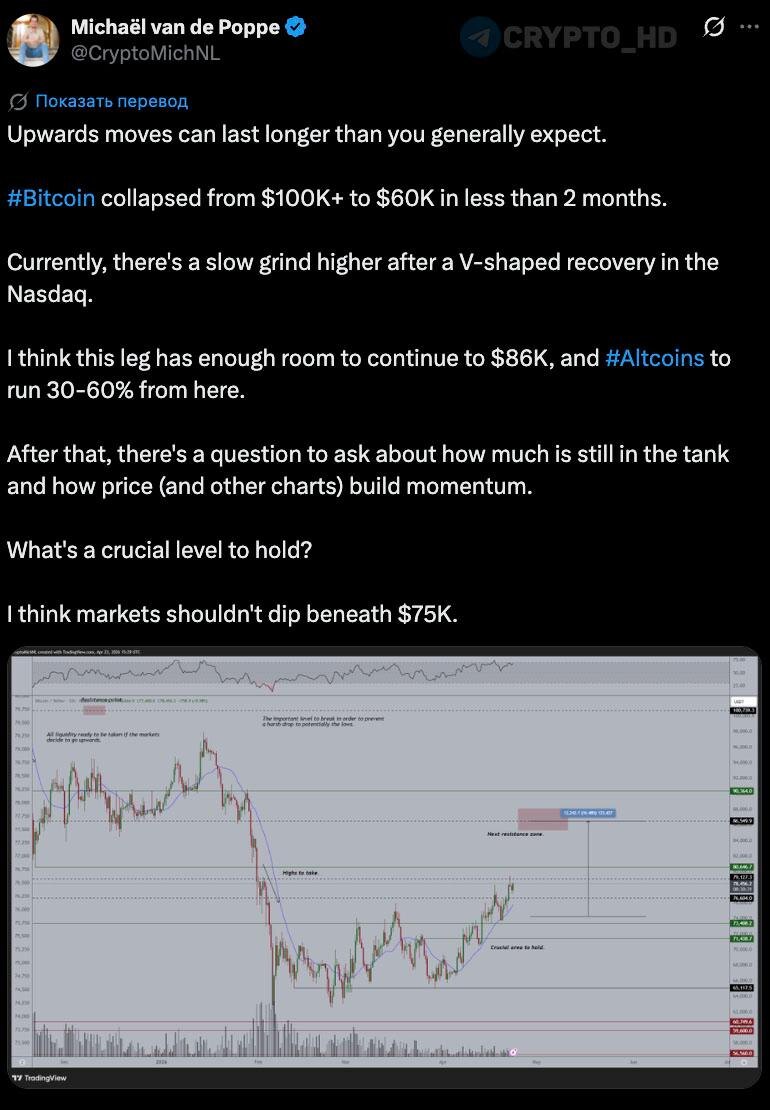 🤔 Michaël van de Poppe считает, что у Биткоина есть пространство для движения к $86,000, а альткоины могут вырасти на 30-60%. Драйверы роста: возврат риск-аппетита после V-образного отскока Nasdaq, постепенное восстановление импульса на рынке и удержание ключевого уровня поддержки $75,000. Crypto Headlines