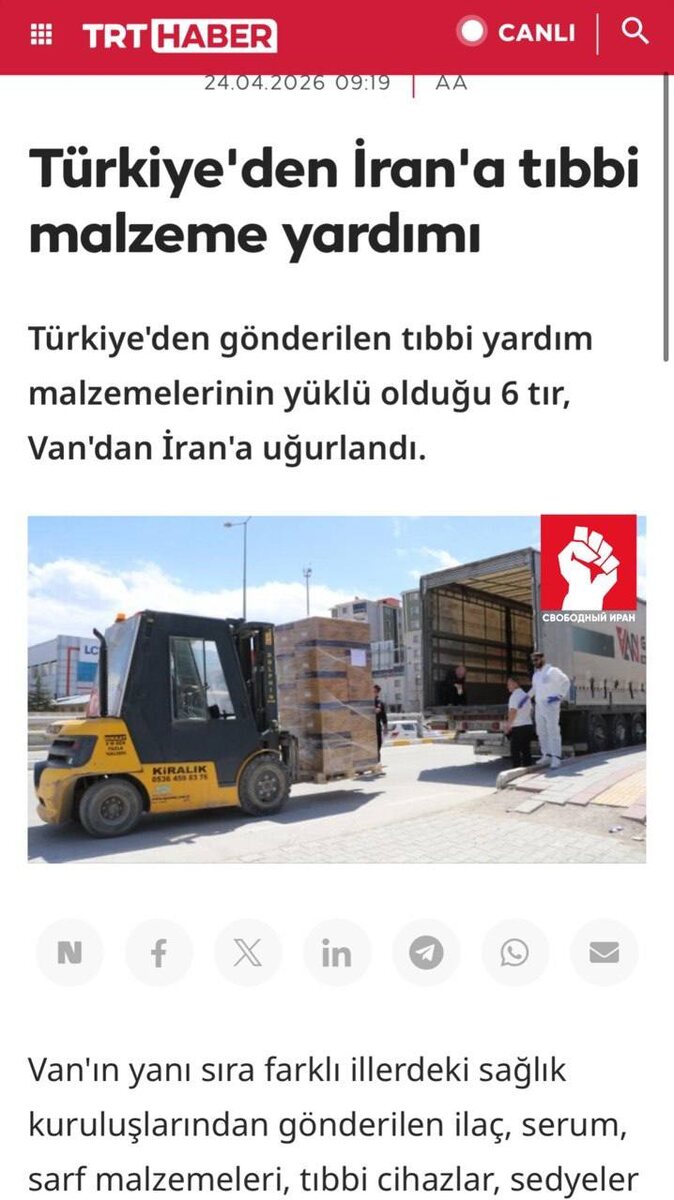 🚑 Турция направила в Иран 6 грузовиков с медикаментами и медматериалами. Груз собрали по всей стране, свезли в Ван и оттуда отправили дальше в Иран. Подпишитесь на канал