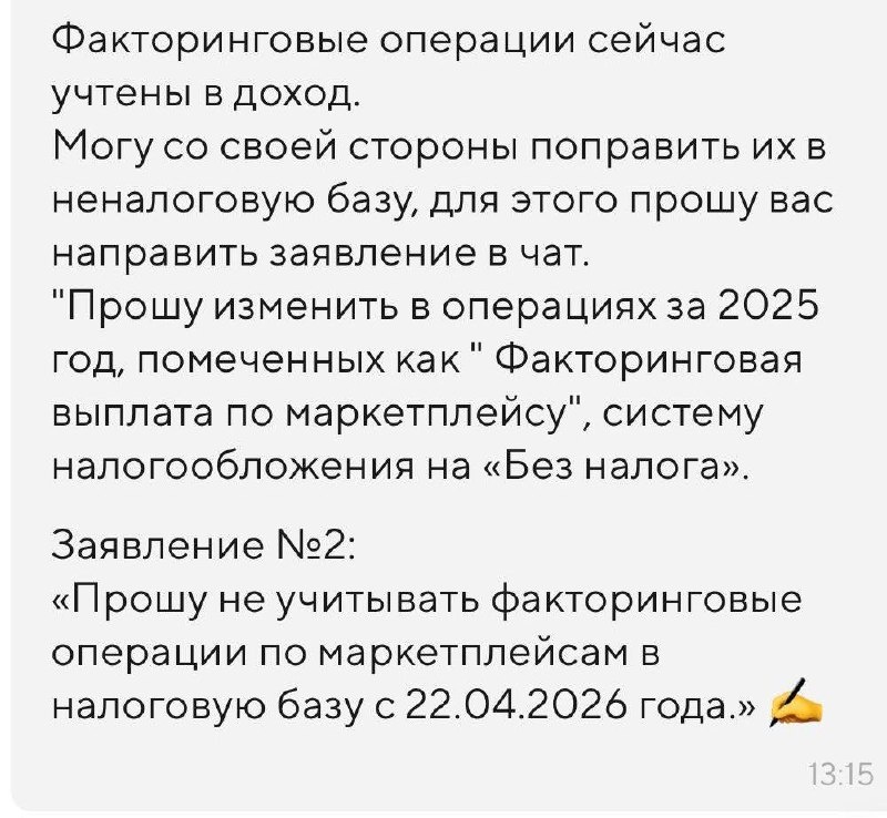 После прошлого поста про Точку начали писать в личку. И там уже не один случай. Схема повторяется. Подключён гибкий график выплат или факторинг → деньги приходят частями → а в бухгалтерии это учитывается как доход. И не тот, что реально получил на счёт, а больше. В итоге у людей расходится картина: по факту получили условно 50 тыс, в отчётах — уже 150+ тыс оборота. Разницу никто автоматически не чистит. Самое интересное — реакция поддержки. Сначала: «всё считается корректно». Потом, когда начинаешь разбирать конкретные операции: «ну да, факторинг нужно исключать вручную». И дальше предлагают писать заявления, чтобы это перевели в неналоговую базу. То есть по умолчанию система может завышать доход, а исправлять это должен сам селлер. Люди пишут, что за пару месяцев так переплатили десятки тысяч рублей налогов. История становится системной. Если работаете с факторингом или гибкими выплатами — лучше отдельно проверить, как у вас считается доход. Иначе можно узнать о «дополните